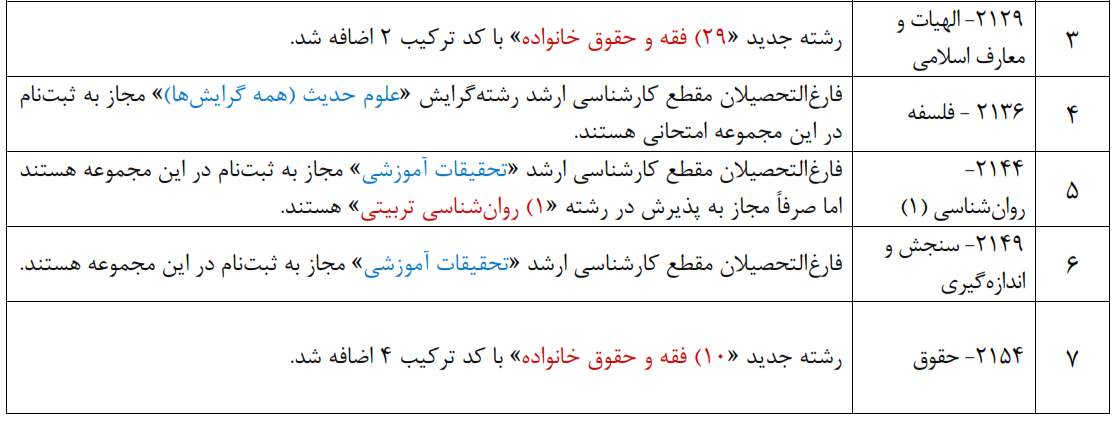 همچنین در ردیف ۳ جدول، رشته جدید «فقه و حقوق خانواده» با کدترکیب ۲ به مجموعه الهیات و معارف اسلامی اضافه شده است.