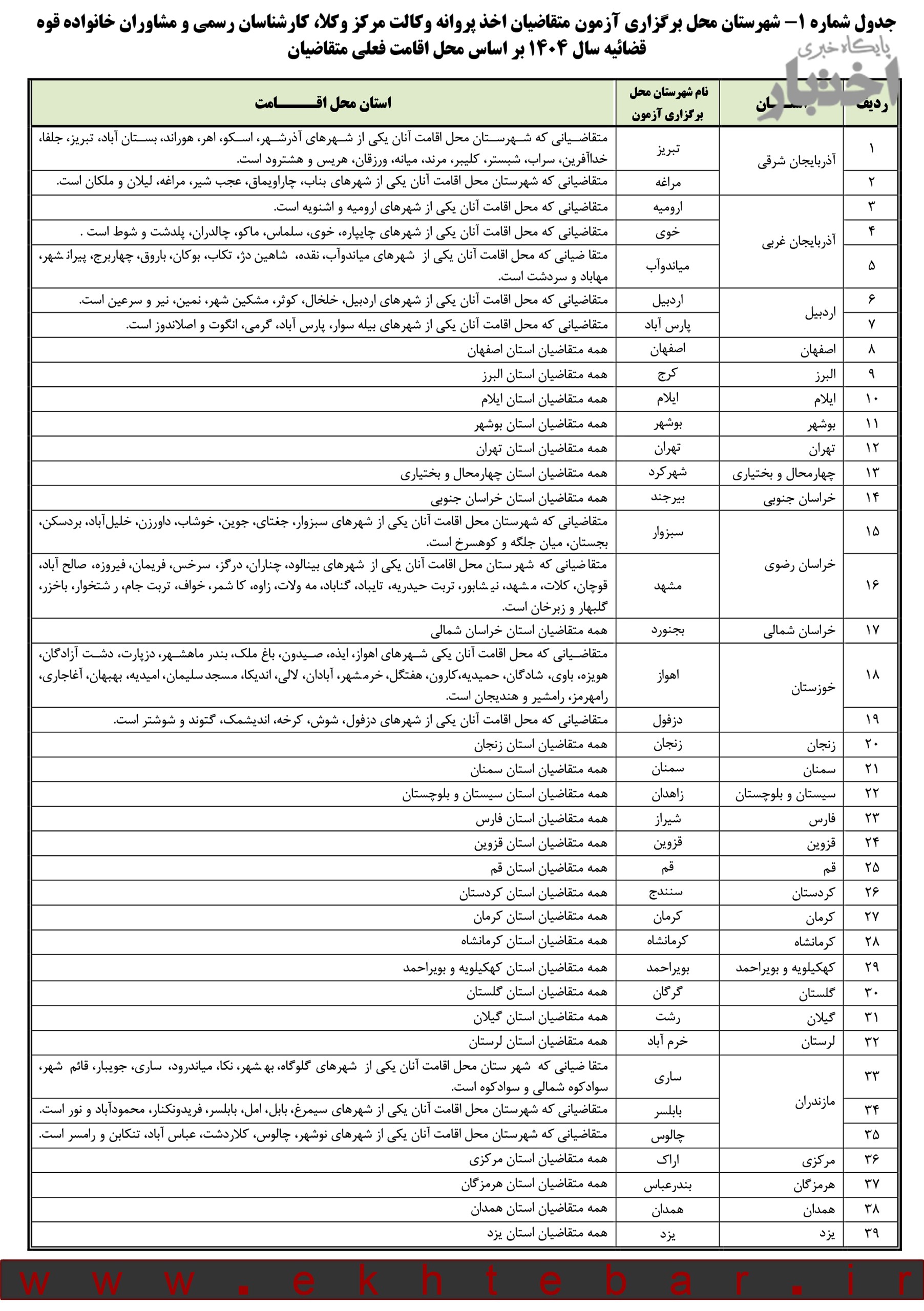 شهرهای محل برگزاری آزمون مرکز وکلای قوه قضاییه ۱۴۰۴